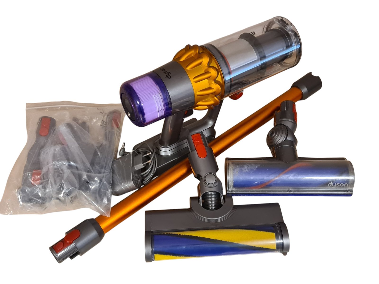 Komplektacija: Dyson V15 belaidis dulkių siurblys, minkštas šepetys (kietai grindų dangai), kietas šepetys (kiliminei dangai), antgaliai ir įkroviklis.