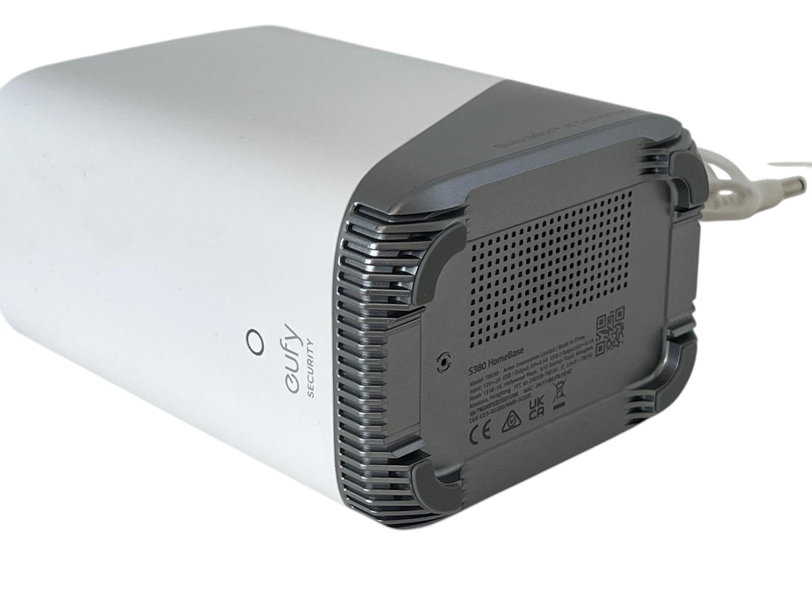Iš ekspozicijos Eufy Homebase 3 stotelė. Eufy HomeBase 3 – tai pažangus belaidis saugumo centras, skirtas valdyti ir integruoti visus Eufy Security įrenginius. Šis įrenginys išsiskiria dideliu vietiniu saugojimo pajėgumu, dirbtinio intelekto funkcijomis ir paprastu įdiegimu be mėnesinių mokesčių. Suteikiama 6 mėnesių garantija.