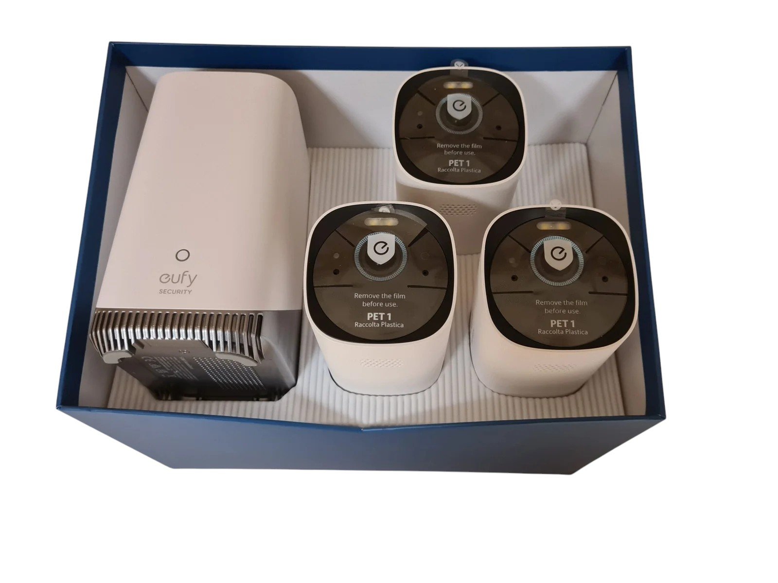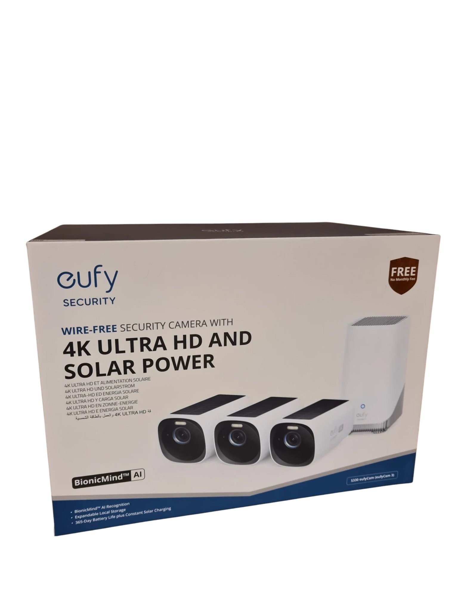Ekspozicinės EufyCam S330 (3+1) stebėjimo kameros. EufyCam S330 yra belaidė išorinė 4 K stebėjimo sistema su integruota saulės baterija, skirta nepriklausomam ir autonomiškam namų stebėjimui. Komplekte yra 3 kameros ir HomeBase 3, kuri saugo vaizdo įrašus vietoje, be prenumeratos, ir suteikia pažangias AI funkcijas su BionicMind atpažinimu – tai naudinga atskirti žmones, automobilius, augintinius bei pažįstamus veidus. Suteikiama 6 mėnesių garantija.