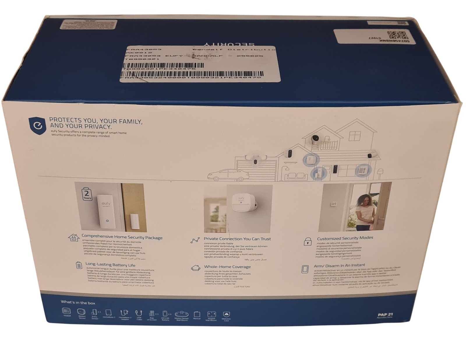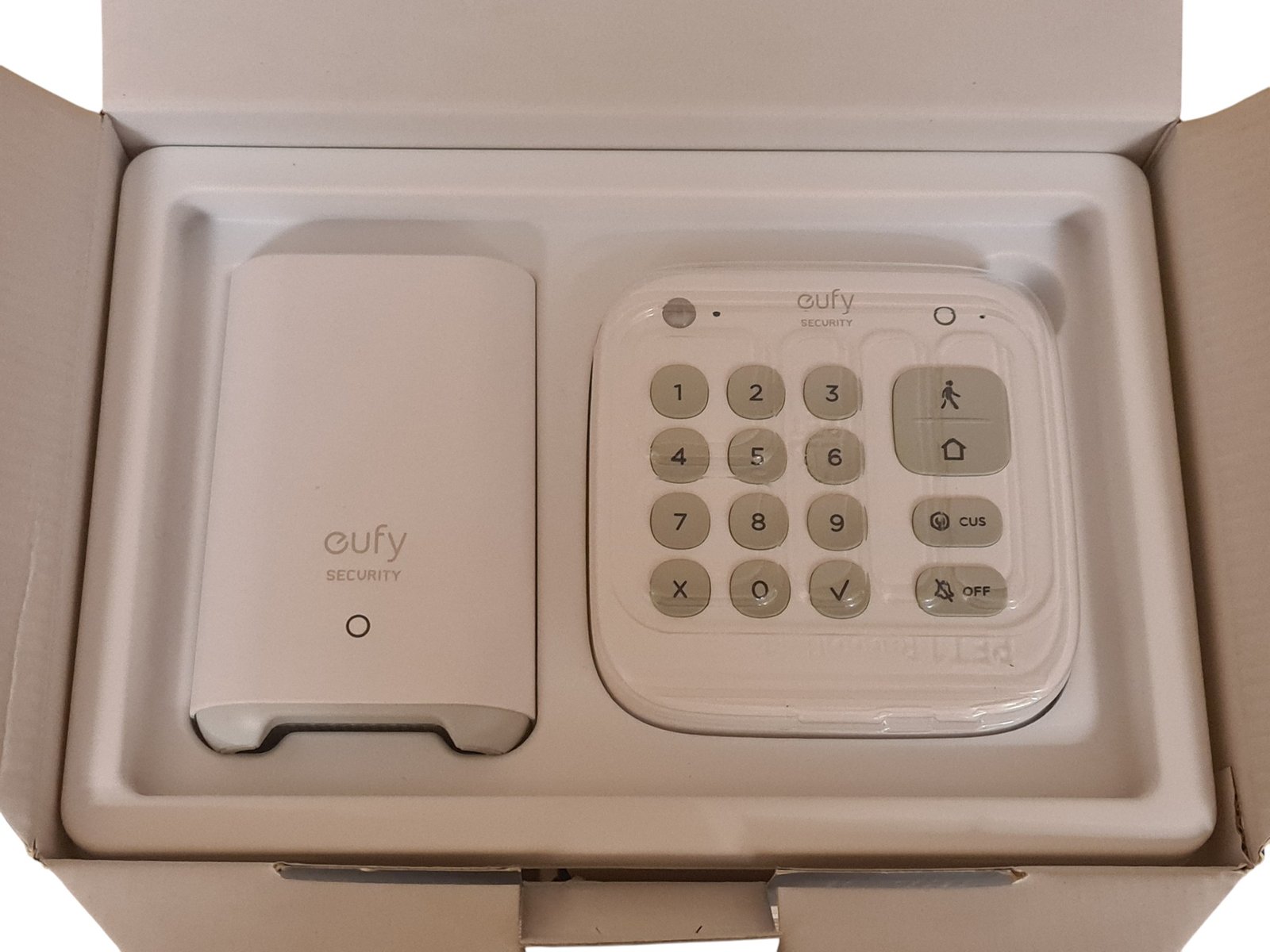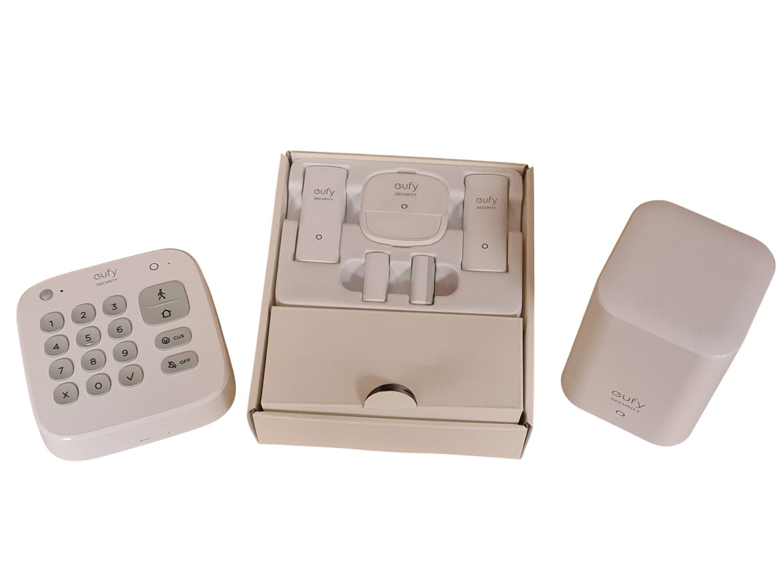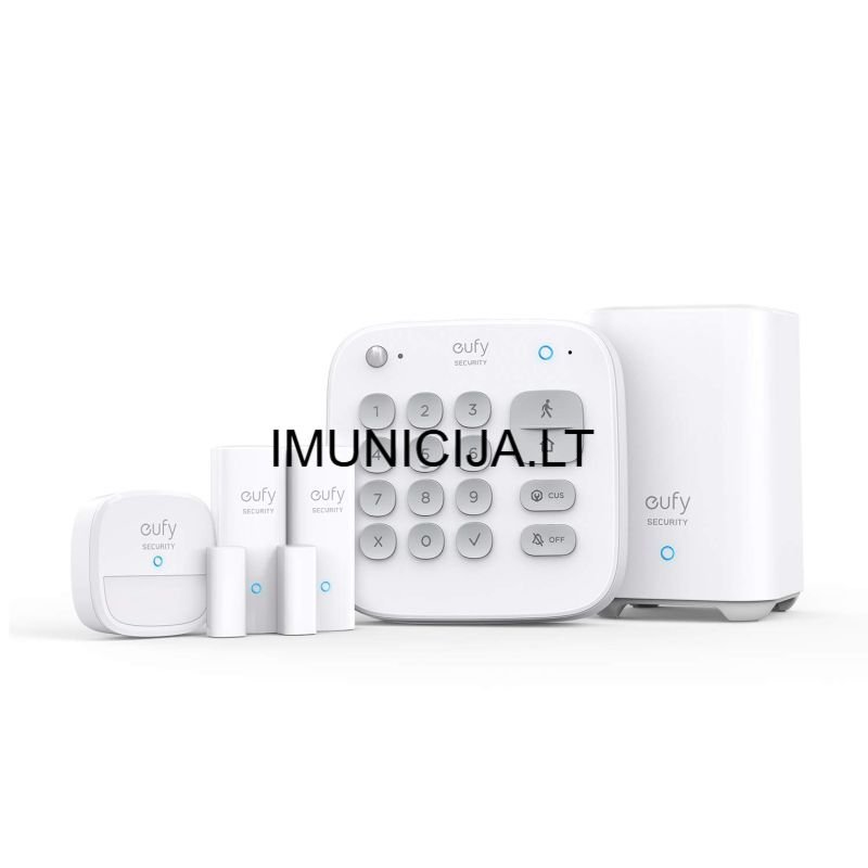 Iš ekspozicijos EufyCam Security 5-Pierce Alarm Kit namų aspauga. Eufy Security 5-Piece Alarm Kit – belaidė namų apsaugos sistema, skirta vidinėms patalpoms, kurią galite įsidiegti patys be profesionalų pagalbos. Komplektas veikia su Eufy Security mobiliąja programėle ir siunčia momentinius pranešimus į telefoną, kai aptinka judesį ar durų/langų atidarymą. Mėnesinių mokesčių nėra – tai vienkartinis sprendimas su Wi-Fi ryšiu ir papildomų jutiklių palaikymu. Suteikiama 6 mėnesių garantija.