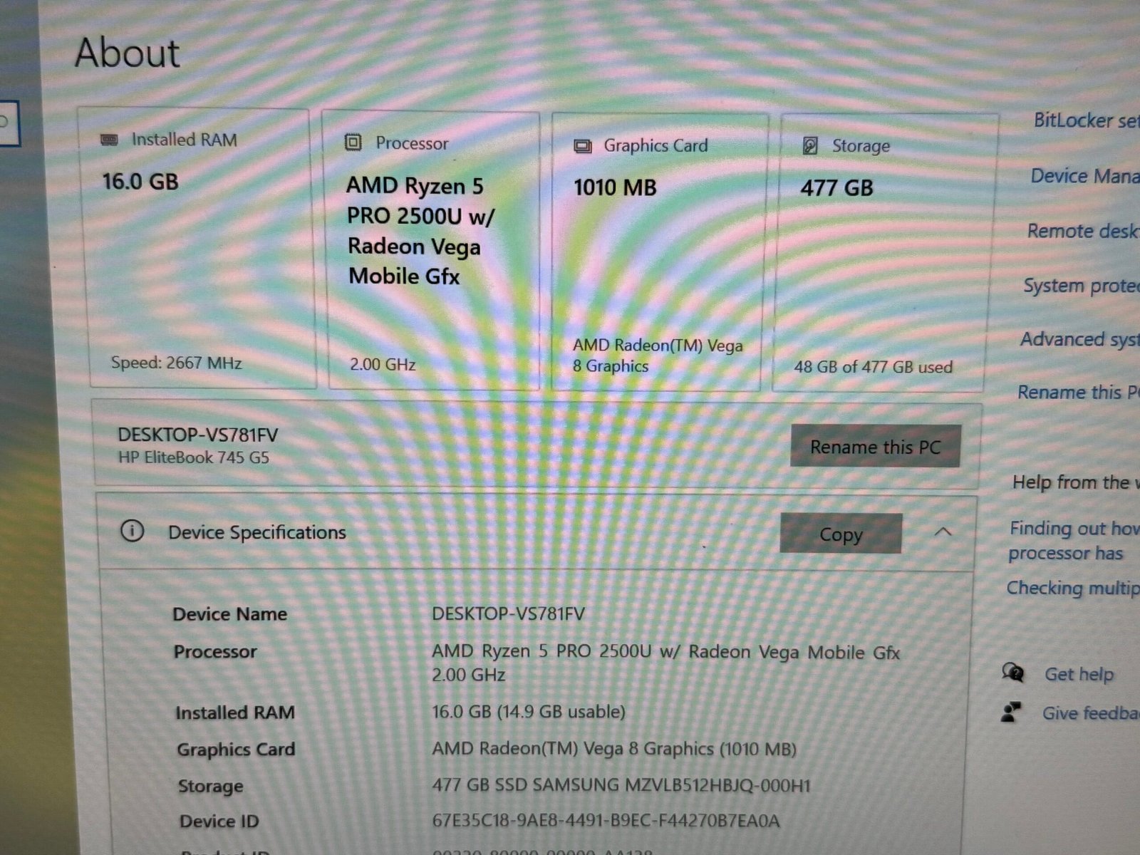 - Procesorius: AMD Ryzen 5 Pro 2500U 4 branduoliai, bazinis dažnis ~2.0 GHz, „Turbo“ iki ~3.6 GHz