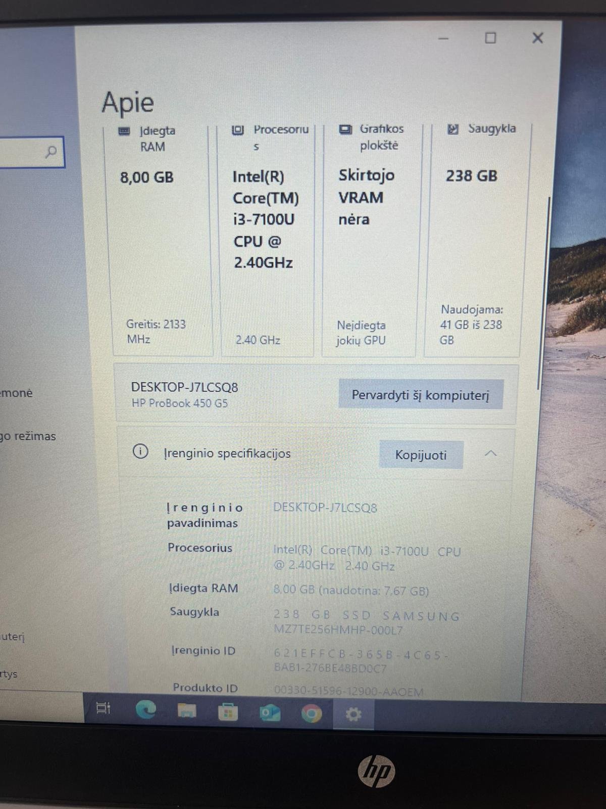 Naudotas HP ProBook 450 G5 nešiojamas kompiuteris. Kompiuterio korpusas turi pabraižymų. Klaviatūra graži, klavišai nenutrinti. Kompiuteris yra paruoštas naujam savininkui, suinstaliuoti Windows 10 Pro, kompiuteryje yra įdėtas 256GB SSD kietasis diskas, kuris paspartins kompiuterio darbą. Baterija laiko apie 5 valandas. Suteikiama 3 mėnesių garantija.
