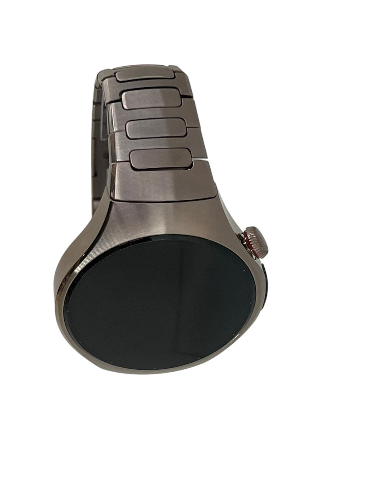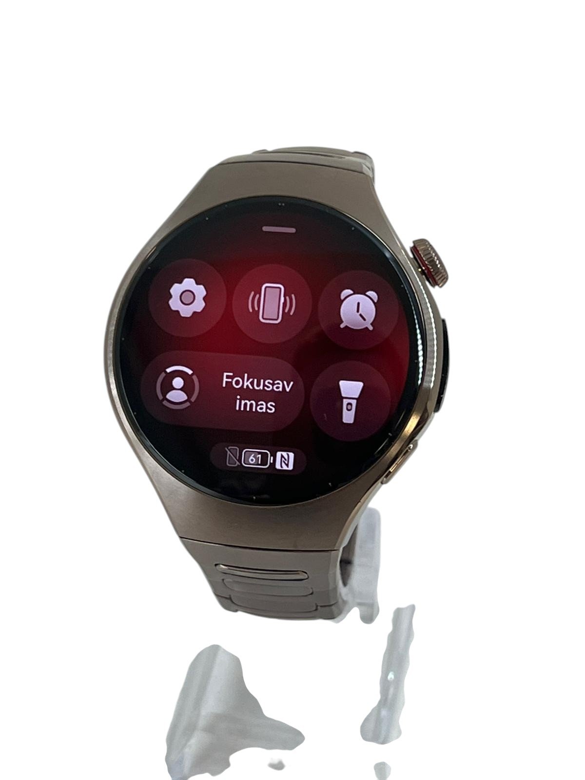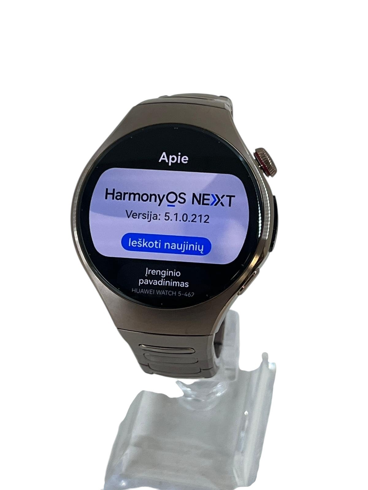 Ekspozicinis Huawei Watch 5 Sand Gold išmanusis laikrodis. Tai elegantiškas ir kompaktiškas išmanusis laikrodis, pagamintas iš aukštos klasės 904L nerūdijančio plieno su safyro stiklu ir rafinuota titano apyranke. Jis pasižymi 1.38″ LTPO AMOLED ekranu, modernia sveikatos stebėjimo sistema su EKG, SpO₂, kūno temperatūros bei arterijų standumo matavimais. Palaiko eSIM, turi tikslią dvigubo dažnio GPS sistemą, veikia su HarmonyOS ir išlaiko iki 7 dienų bateriją.