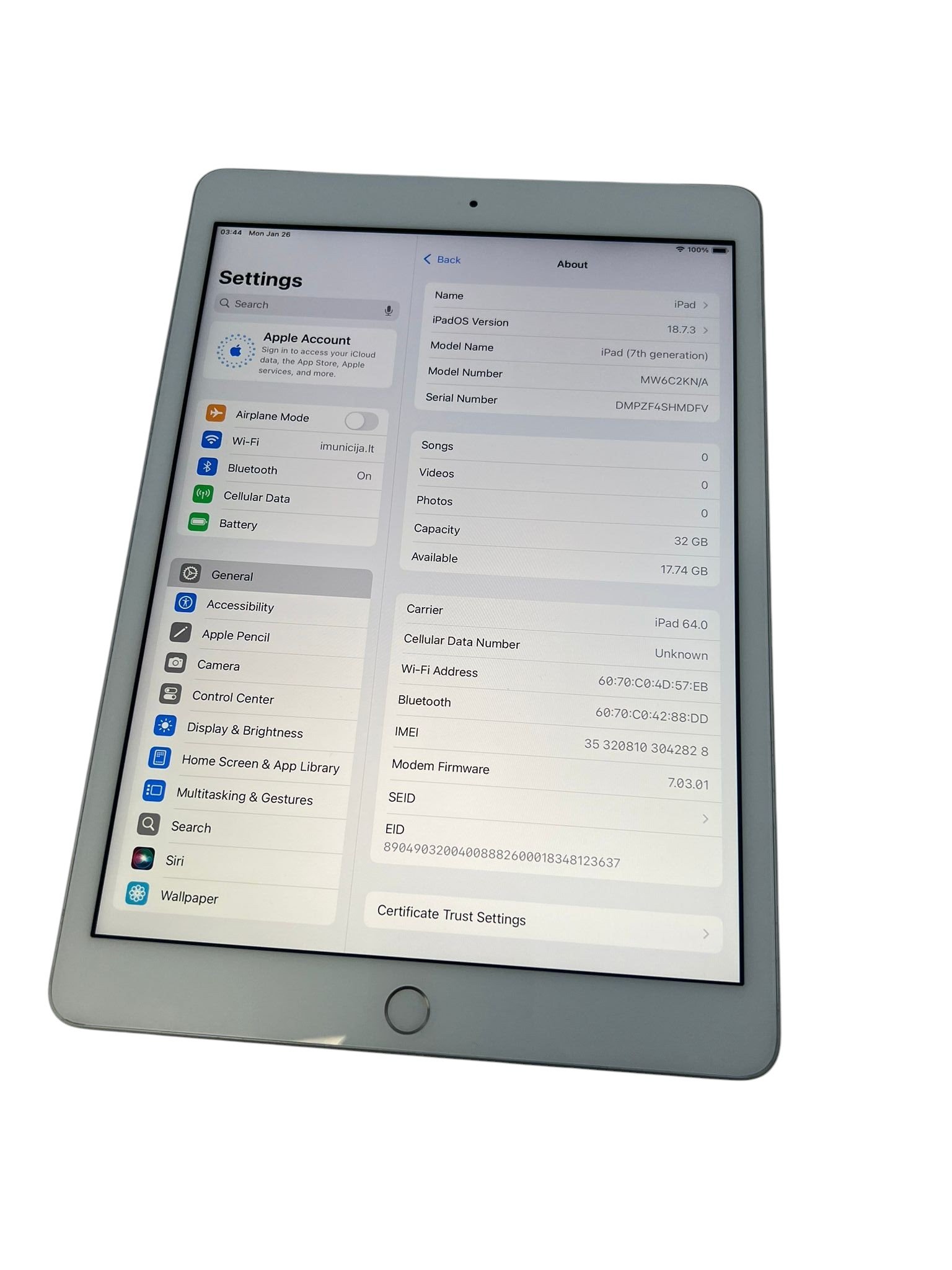 Naudota iPad (7th Generation) planšetė. Viskas veikia be problemų, dedasi SIM kortelė, palaiko 4G ryšį. Planšetės ekranas ir nugarėlė turi pabraižymų, naudojimo žymių. Piršto skaitytuvo funkcija (Touch ID) veikia. Battery Health: 100%. Modelis: A2198. Suteikiama 3 mėnesių garantija.