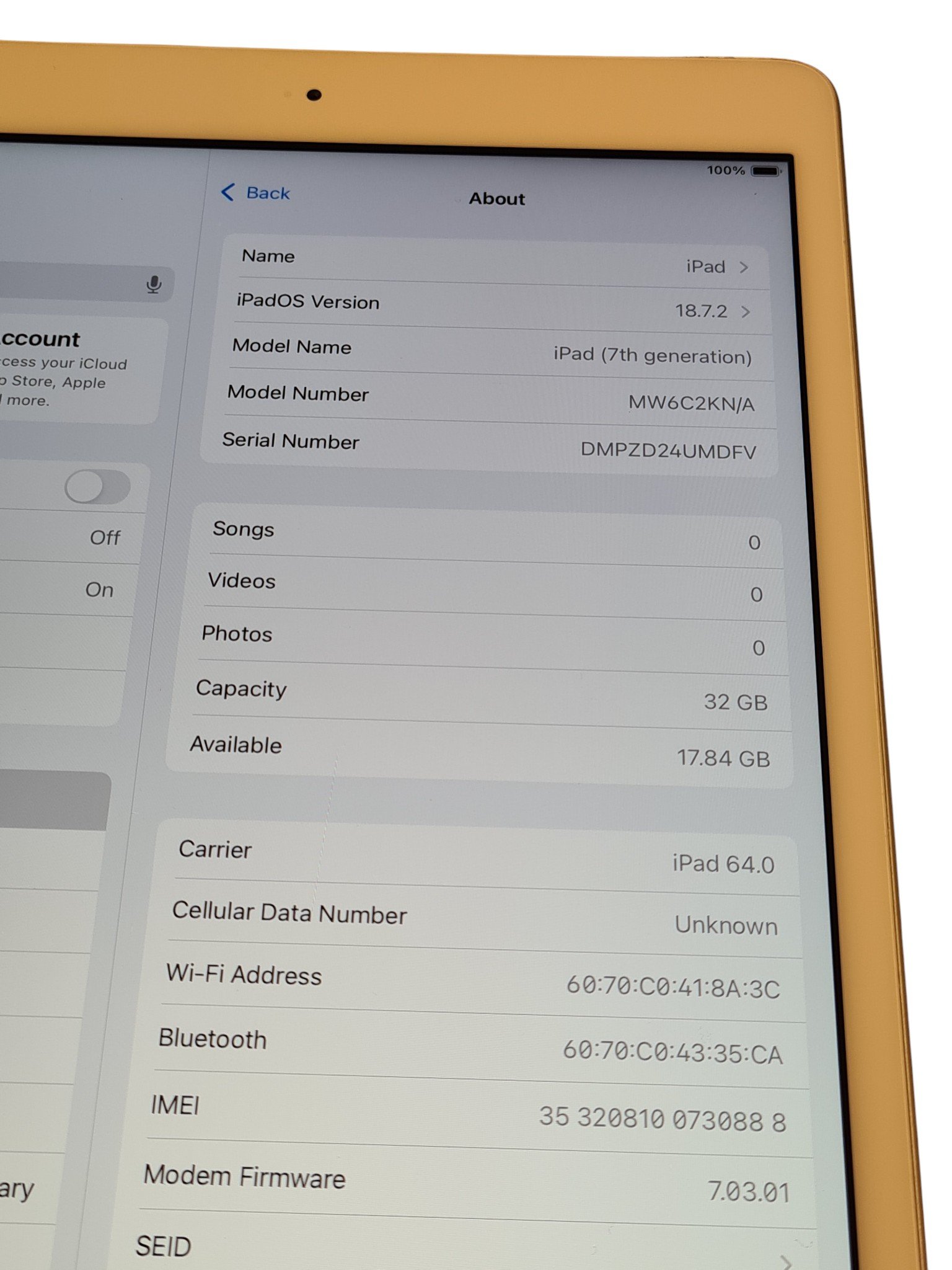Naudota iPad (7th Generation) planšetė. Viskas veikia be problemų, dedasi SIM kortelė, palaiko 4G ryšį. Planšetės ekranas ir nugarėlė turi pabraižymų, naudojimo žymių. Piršto skaitytuvo funkcija (Touch ID) veikia. Battery Health: 89%. Modelis: A2198. Suteikiama 3 mėnesių garantija.