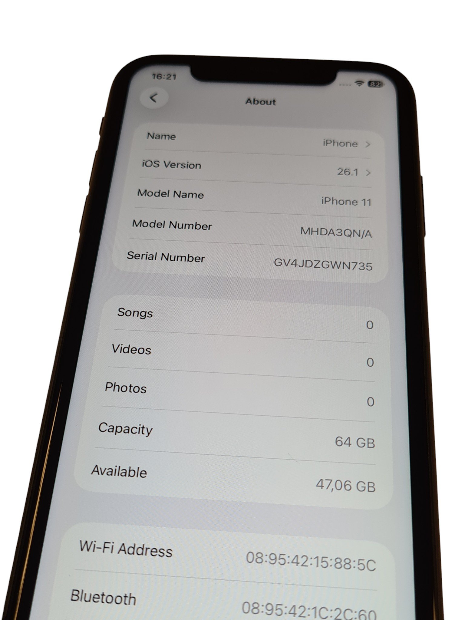 Naudotas iPhone 11 telefonas. Yra telefono naudojimo požymiai, pabraižymai. Viskas veikia be problemų, veido atpažinimo funkcija (Face ID) veikia. Battery Health: 97%. iPhone iOS Version: 26.1. Suteikiama 3 mėnesių garantija.