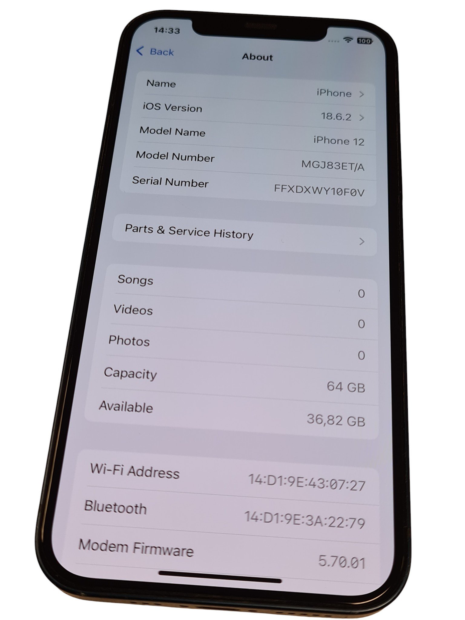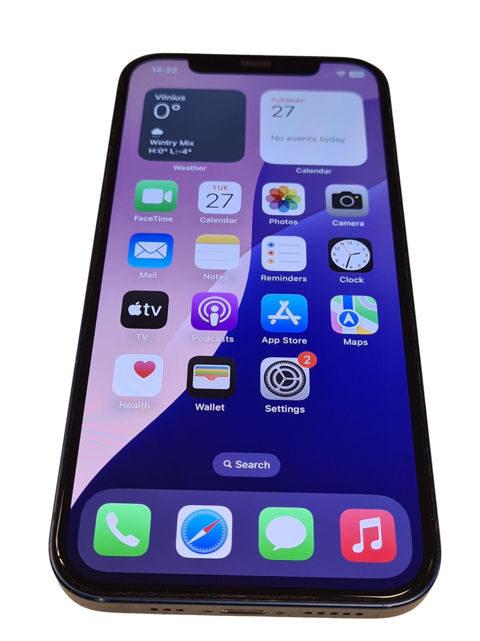 Naudotas iPhone 12 telefonas. Yra telefono naudojimo požymiai, nugarėlės pabraižymai. Ant telefono ekrano yra užklijuotas apsauginis stikliukas. Viskas veikia be problemų, veido atpažinimo funkcija (Face ID) veikia. Battery Health: 77%, testuojant baterija laiko 4 valandas ir liko dar 30% baterijos. iPhone iOS Version: 18.6.2. Suteikiama 3 mėnesių garantija.