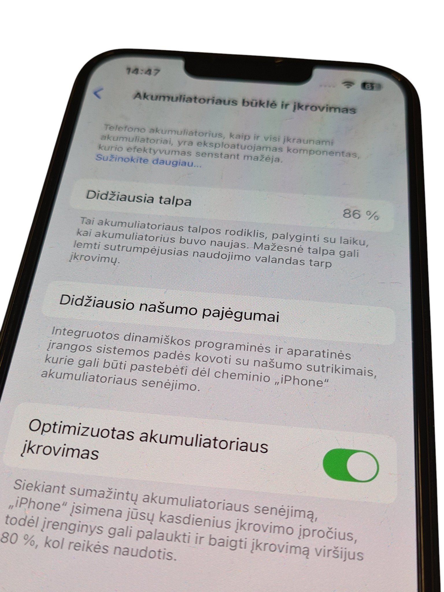 - Baterija: ~3279 mAh, greitas įkrovimas, MagSafe / Qi belaidis įkrovimas