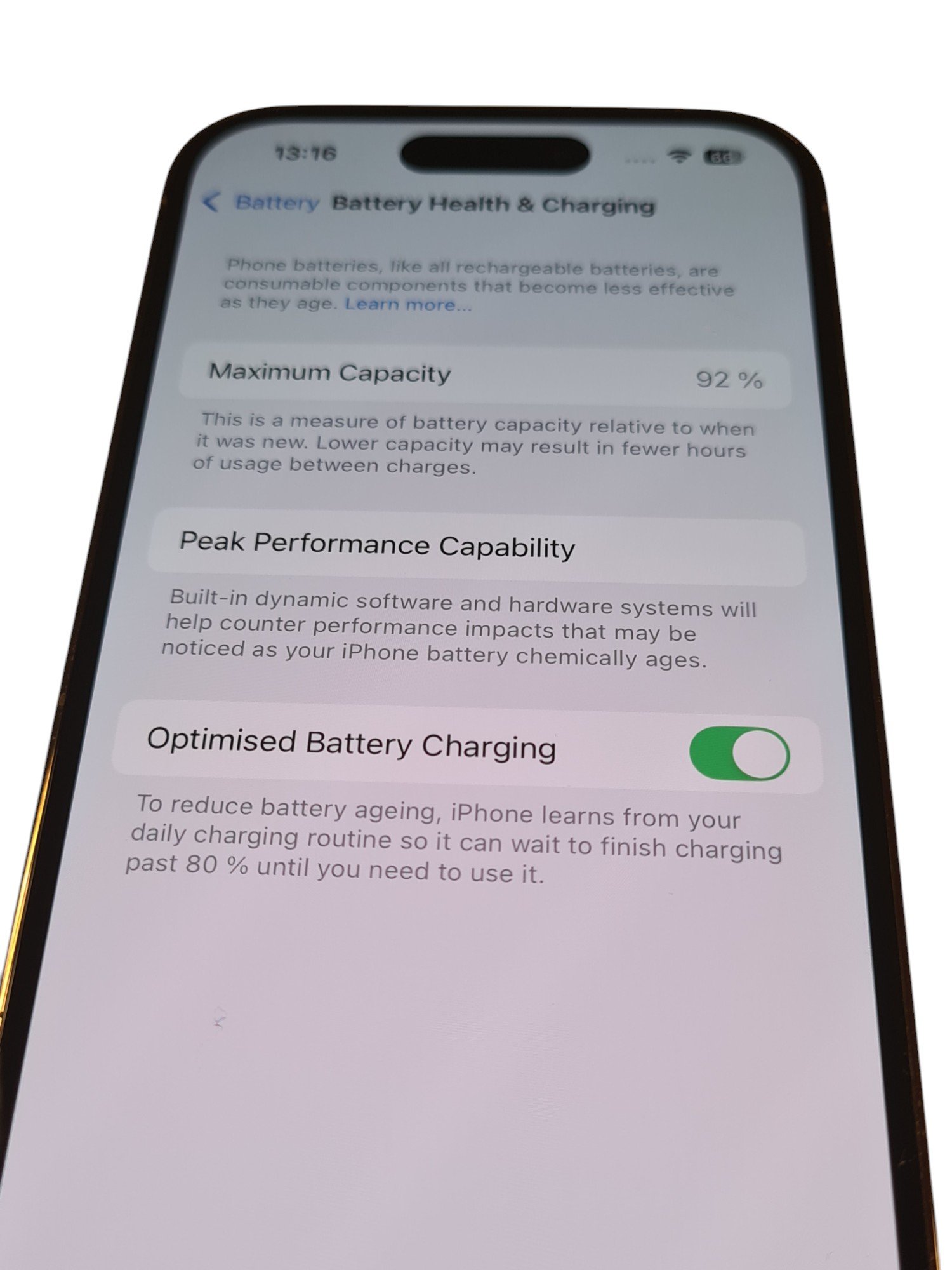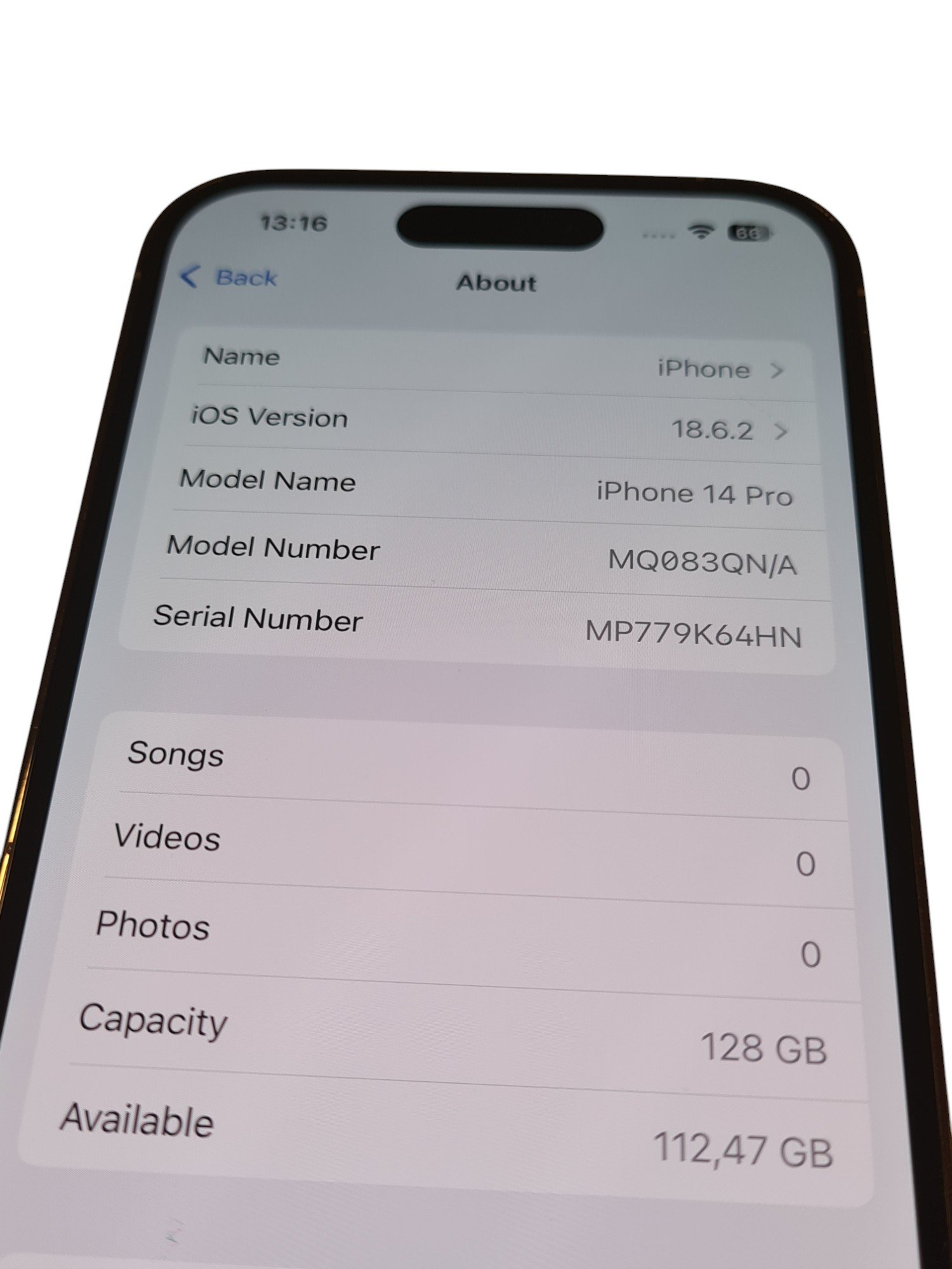 Naudotas, pilnai veikiantis iPhone 14 Pro. iPhone 14 Pro – tai Apple flagmanų linijos telefonas, išleistas 2022 m. rugsėjo mėn. Jis pasižymi aukštos klasės komponentais: pažangiu A16 Bionic procesoriumi, Pro kamerų sistema su 48 MP pagrindiniu jutikliu, Dynamic Island ekranu su Always-On funkcija, ir gerais atsparumo bei saugumo sprendimais (pvz. IP68, LiDAR, „Emergency SOS via satellite“). Modelis su 128 GB vidinės atminties siūlo puikų balanso variantą tarp kainos ir galimybių. Yra telefono ekrano ir telefono šonų keletas pabraižymų, nugarėlė graži. Battery Health: 92%. Suteikiama 3 mėnesių garantija.
