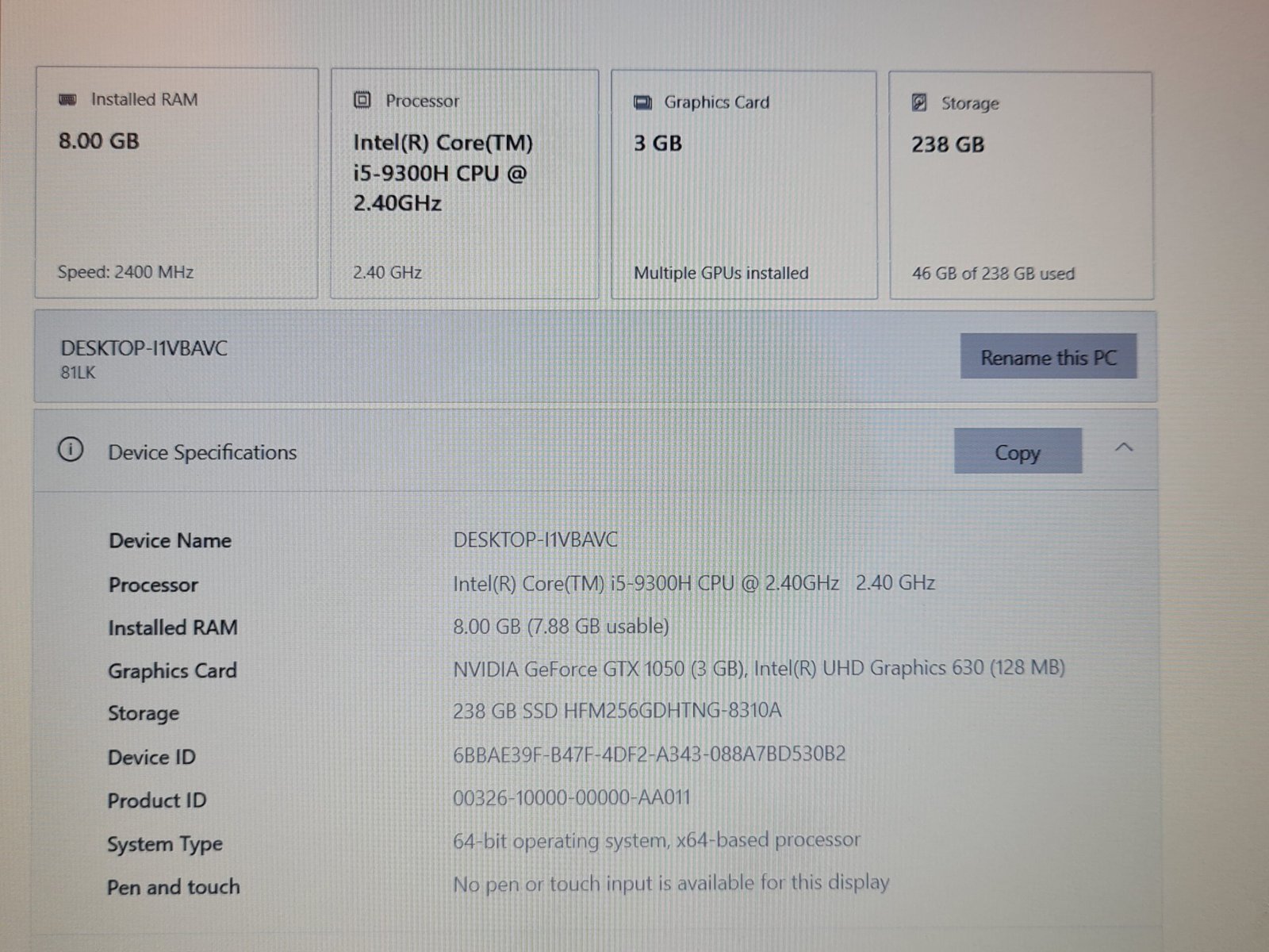 - Procesorius (CPU): Intel Core i5-9300H (9-os kartos, 4 branduoliai / 8 gijos; bazinis / boost dažnis ~2.4 GHz / iki ~4.1 GHz)