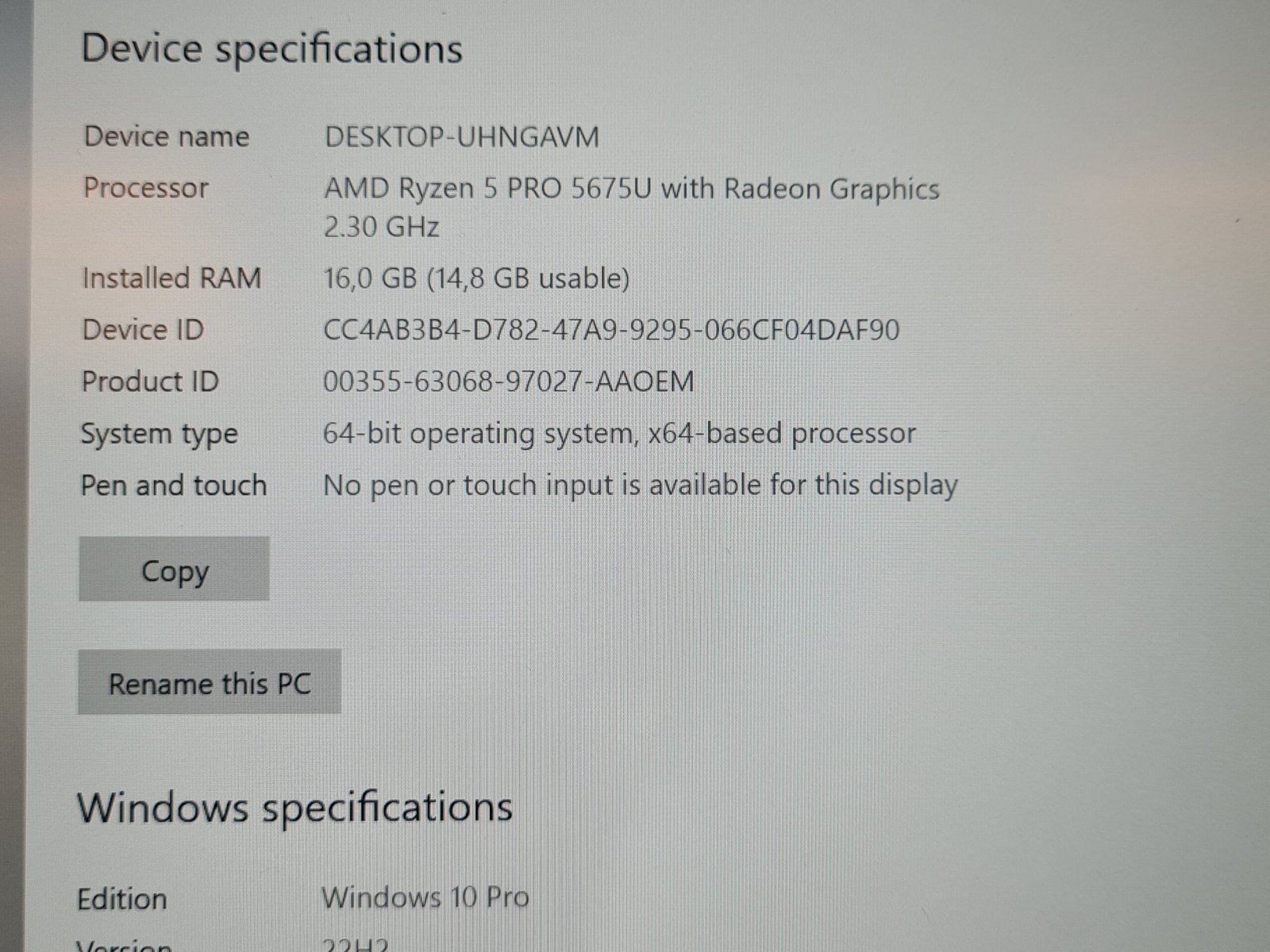 - Procesorius: AMD Ryzen 5 PRO 5675U (6 branduolių, 12 gijų, bazinis dažnis 2.3 GHz, maksimali dažnio didinimo vertė 4.3 GHz) su 16 MB L3