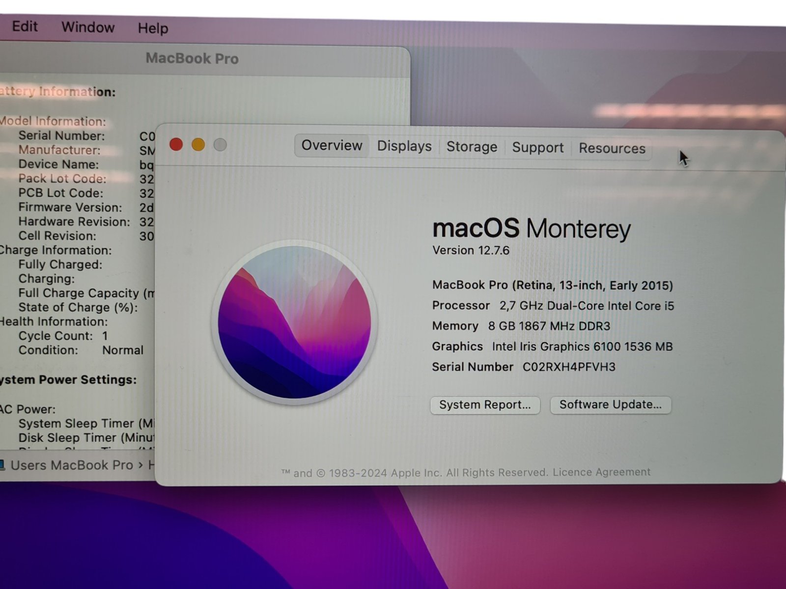 Naudotas, verslo klasės nešiojamasis kompiuteris: MacBook Pro 13″ 2015 metų. Kompiuteris tiks tiek darbui, tiek kasdieniam naudojimui. Metalinis korpusas – komfortabilus nešiojimuisi patenkins daugelio iš Jūsų poreikius. Mėgaukitės ryškiu vaizdu, užtikrintu mobilumu ir produktyvumu, kad ir kur būtumėte, kad ir ką bedarytumėte. Kompiuterio korpusas turi pabraižymų, naudojimo žymių. Ekrano apsauginė danga yra pažeista, matosi nusidėvėjimo žymių, primenančių įbrėžimus. Kompiuteris paruoštas naujam savininkui, pakeista nauja baterija. Testuojant baterija laiko apie 3 valandas ir liko dar 50% baterijos. Suteikiama 3 mėnesių garantija.