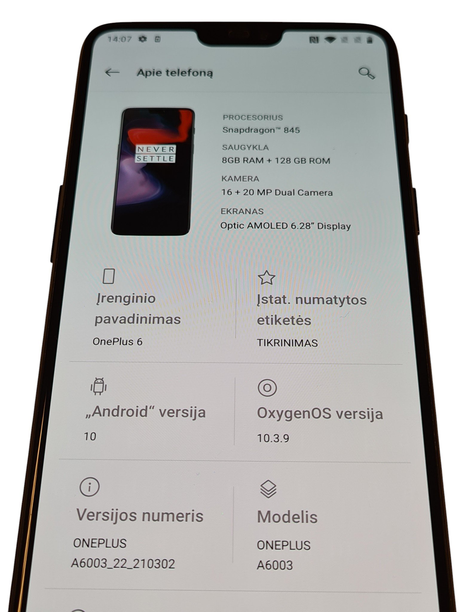 Naudotas, pilnai veikiantis OnePlus 6 telefonas. OnePlus 6 – tai su AMOLED ekranu, galingu Snapdragon 845 procesoriumi ir greituoju „Dash Charge“ įkrovimu telefonas. Siūlo puikų našumo ir kainos santykį, 8 GB RAM užtikrina sklandų darbą, o 128 GB atminties pakanka daugumai naudotojų. Yra telefono ekrano ir nugarėlės pabraižymai. Suteikiama 3 mėnesių garantija.