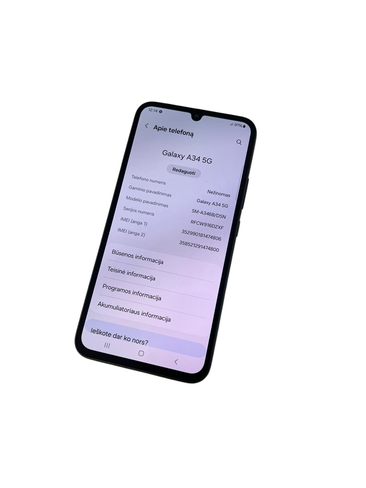 Naudotas, geros būklės Samsung Galaxy A34 5G telefonas. Samsung Galaxy A34 5G – tai subalytinė „Galaxy A“ serijos išmaniojo telefono versija, pasižyminti dideliu ekranu, tvirtu korpusu ir ilgai tarnaujančia baterija. Jis skirtas vartotojams, ieškantiems patikimo ir prieinamo įrenginio kasdieniam naudojimui. Yra parduodamos prekės nedideli pabraižymai. Suteikiama 3 mėnesių garantija.
