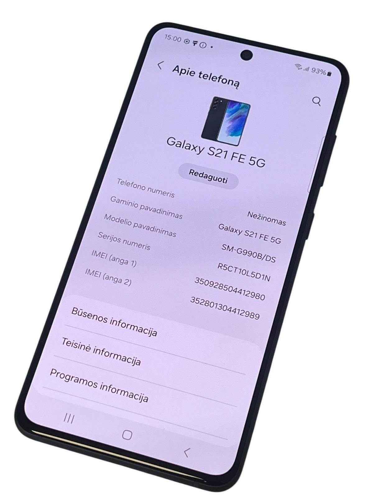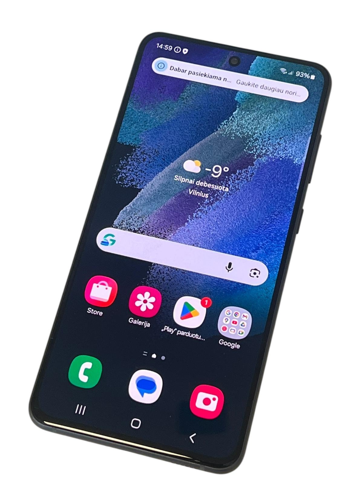 Naudotas, neblogos būklės Samsung Galaxy S21 FE 5G telefonas. Samsung Galaxy S21 FE 5G — tai kompaktiškesnė, šiek tiek supaprastinta “flagmano” versija, su labai subalansuotu funkcionalumu už prieinamą kainą. Jis turi 6.4 colių AMOLED ekraną su 120 Hz atsinaujinimo dažniu, tvirtą konstrukciją su IP68 apsauga nuo dulkių ir vandens, trijų kamerų modulį, 5G palaikymą ir modernų procesorių. Suteikiama 3 mėnesių garantija.