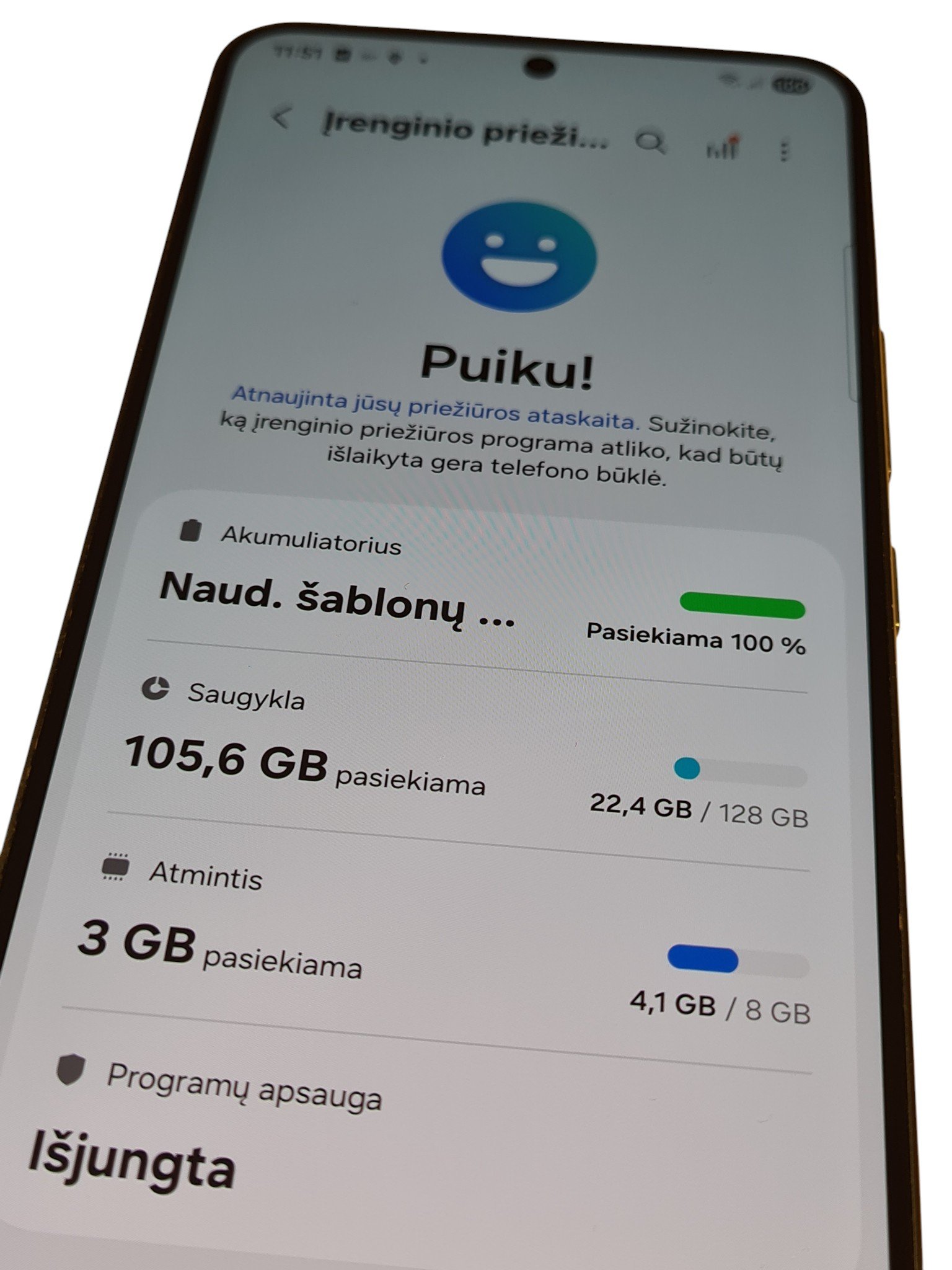 - Atmintis: 8 GB RAM, 128 GB vidinė (UFS 3.1)