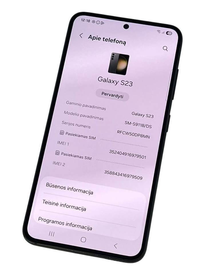 Naudotas, geros būklės Samsung Galaxy S23 telefonas. „Samsung Galaxy S23“ – tai kompaktiškos, premium klasės išmanusis telefonas, pasižymintis aukščiausio lygio medžiagų kokybe, galingu „Snapdragon 8 Gen 2“ procesoriumi, novatorišku „Dynamic AMOLED 2X“ ekranu su 120 Hz adaptuojamu atnaujinimo dažniu ir ilgai veikiančia baterija. Su 8 GB RAM ir 128 GB vidinės atminties versija, šis modelis suteikia puikų balansą tarp našumo ir naudojimo patogumo – idealus kasdieniai naudojimui, žaidimams ir fotografijai. Suteikiama 3 mėnesių garantija.