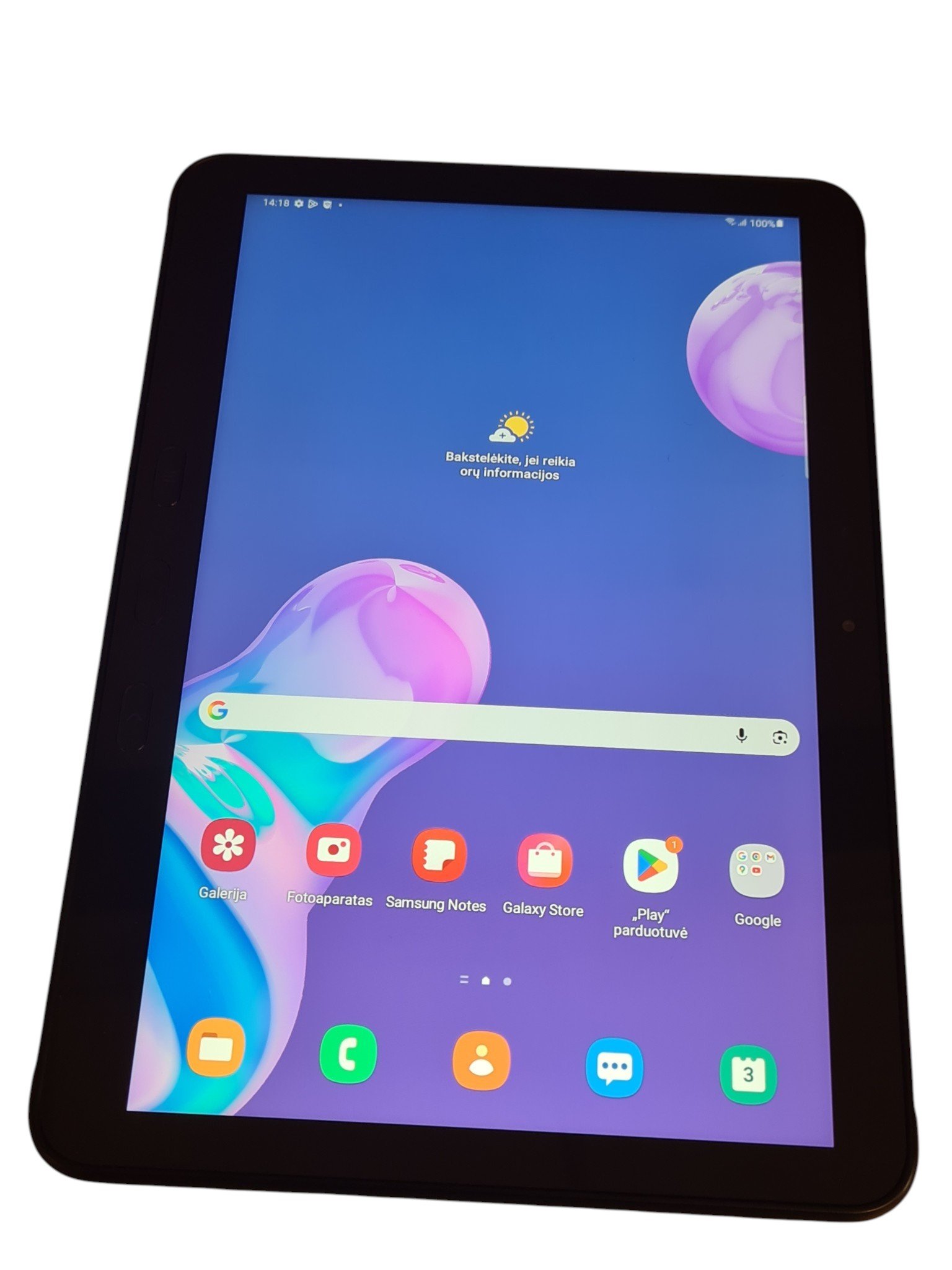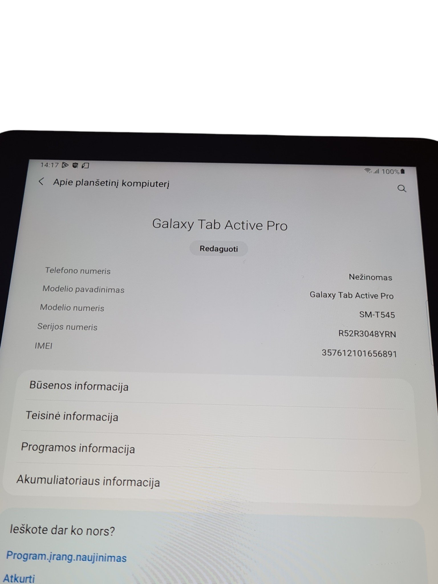 Naudota, pilnai veikianti Samsung Galaxy Tab Active Pro planšetė. Samsung Galaxy Tab Active Pro SM-T545 – tai tvirta, verslui ir lauko darbams pritaikyta 10.1 colių Android planšetė su mobiliojo ryšio (LTE) palaikymu. Ji pasižymi patvariu dizainu (IP68 atsparumas dulkėms ir vandeniui), keičiamu akumuliatoriumi, todėl tinkama naudoti ir sudėtingesnėse aplinkose ar darbinėse situacijose. Yra minimalūs ekrano ir nugarėlės pabraižymai. Baterija laiko gerai, testuojant atlaikė 4 valandas ir liko dar 40% baterijos. Suteikiama 3 mėnesių garantija.