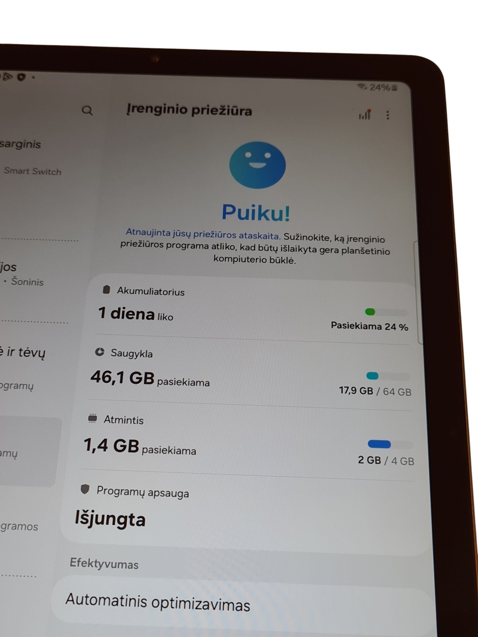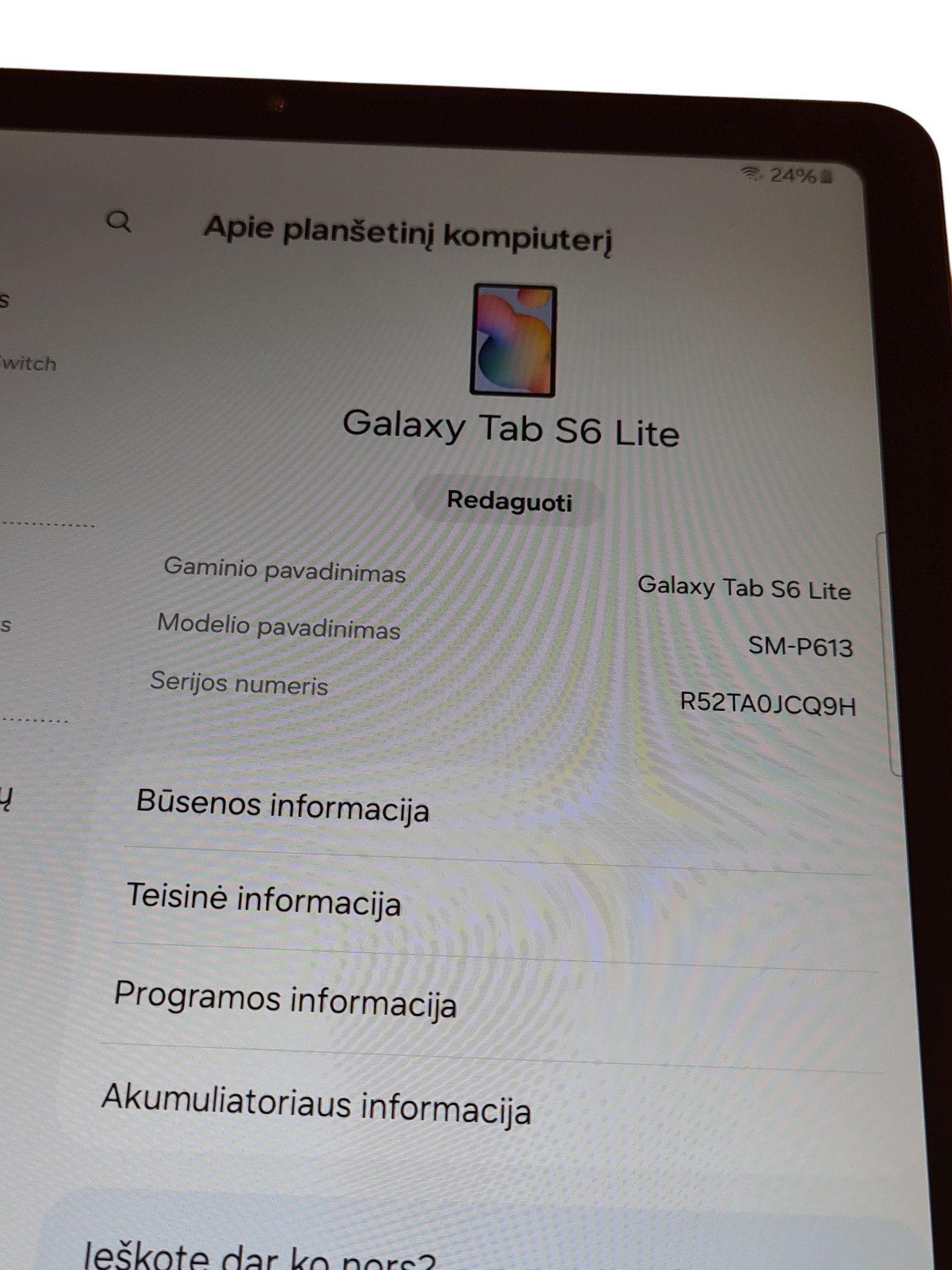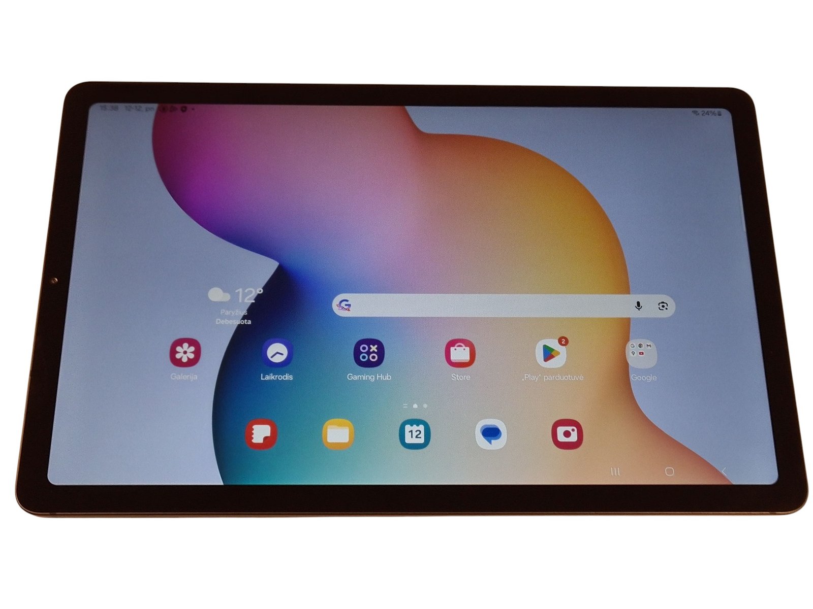 Naudota, geros būklės, pilnai veikianti Samsung Galaxy Tab S6 Lite planšetė. Samsung Galaxy Tab S6 Lite – tai lengva ir stilinga 10.4 colių planšetė. Ji turi didelę 7040 mAh bateriją, dvigubus AKG garsiakalbius su Dolby Atmos, metalinį korpusą ir palaiko microSD atminties plėtrą iki 1 TB. Nors procesorius Exynos 9611 nėra labai galingas, planšetė siūlo gerą kainos ir kokybės santykį kasdieniam naudojimui. Suteikiama 3 mėnesių garantija.