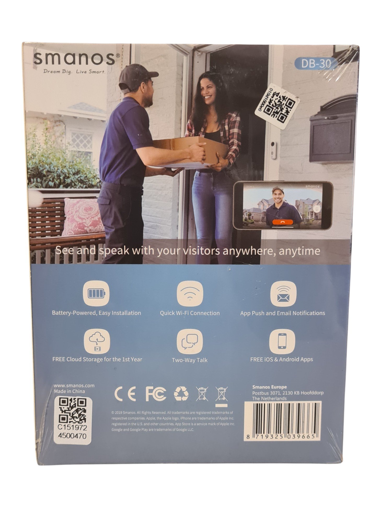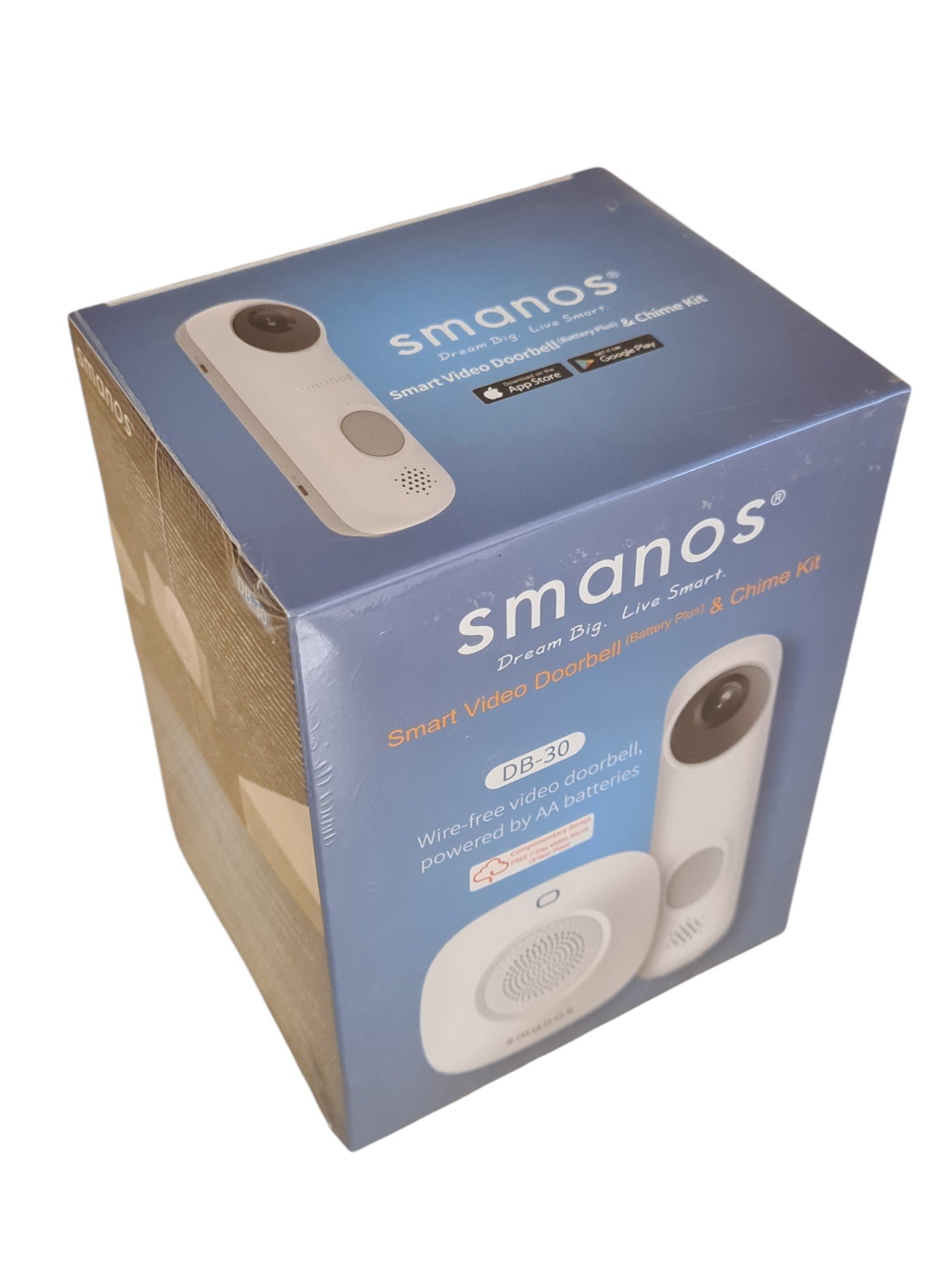 Visiškai nauja, neišpakuota durų skambučio sistema. Smanos DB-30 yra belaidė išmanioji durų skambučio sistema su vaizdo kamera („Battery Plus“ versija), skirta lauko montavimui. Komplekte taip pat yra belaidis vidinis skambutis („Chime“), kurį galima prijungti prie standartinio elektros lizdo namuose. Vartotojai gauna pranešimus į telefoną, kai kas nors paspaudžia skambučio mygtuką, gali matyti 720p raiškos video, kalbėtis dvipusiu ryšiu, net jeigu yra toli nuo namų. Laikomas baterijos naudojimas apie 10-12 mėnesių esant įprastam naudojimui. Suteikiama 6 mėnesių garantija.